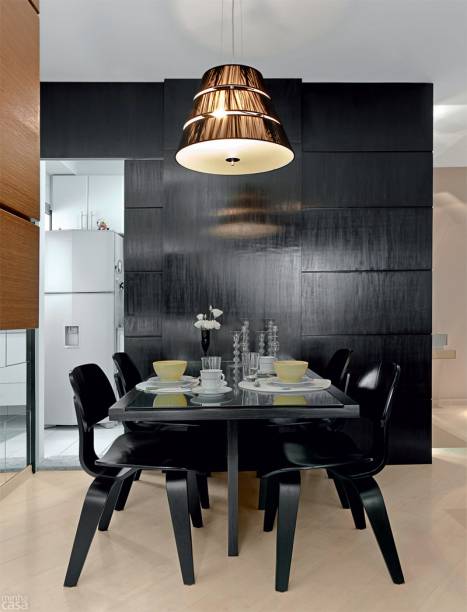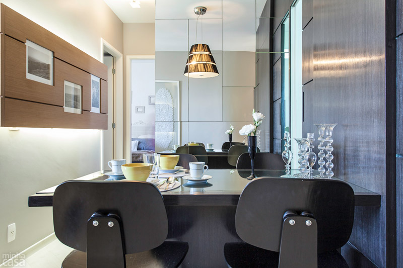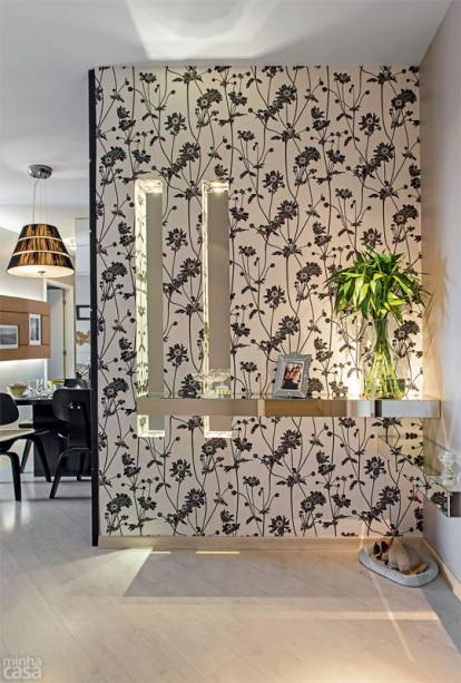 Apartamento de 63 m² com paredes pretas e estampadas