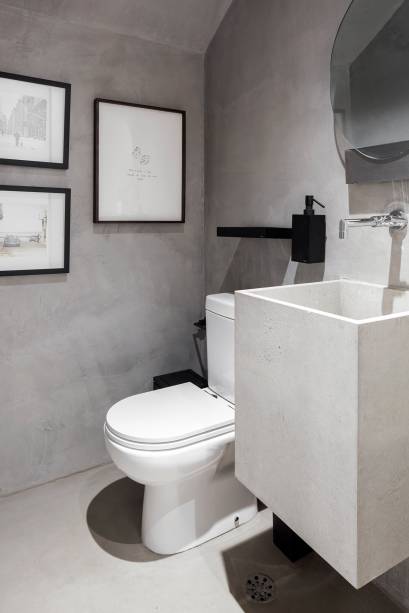 As cubas do banho master são esculpidas e desenhadas em ângulo e toda a marcenaria foi feita sob medida, criando uma caixa de concreto e sensação de continuidade e extensão.