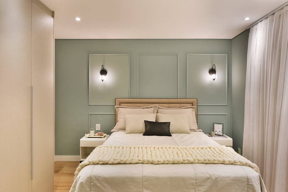 No quarto, um “azul mantra” toma conta do cômodo, para trazer romance junto com as boiseries na parede.