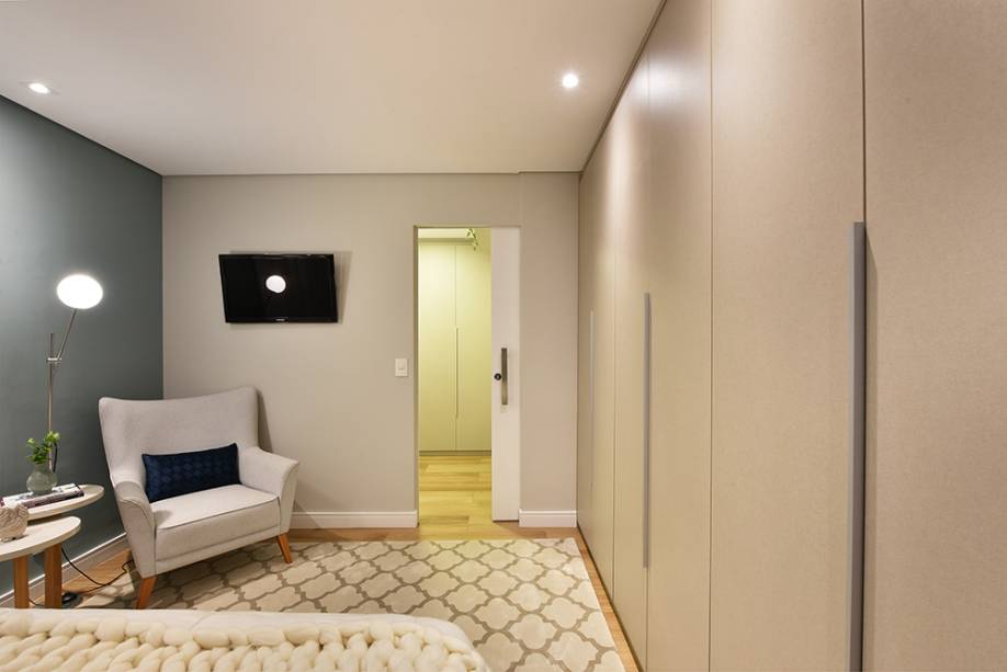 Sendo assim, o apartamento, que originalmente tinha dois quartos, ficou com uma suíte grande, com closet e escritório.