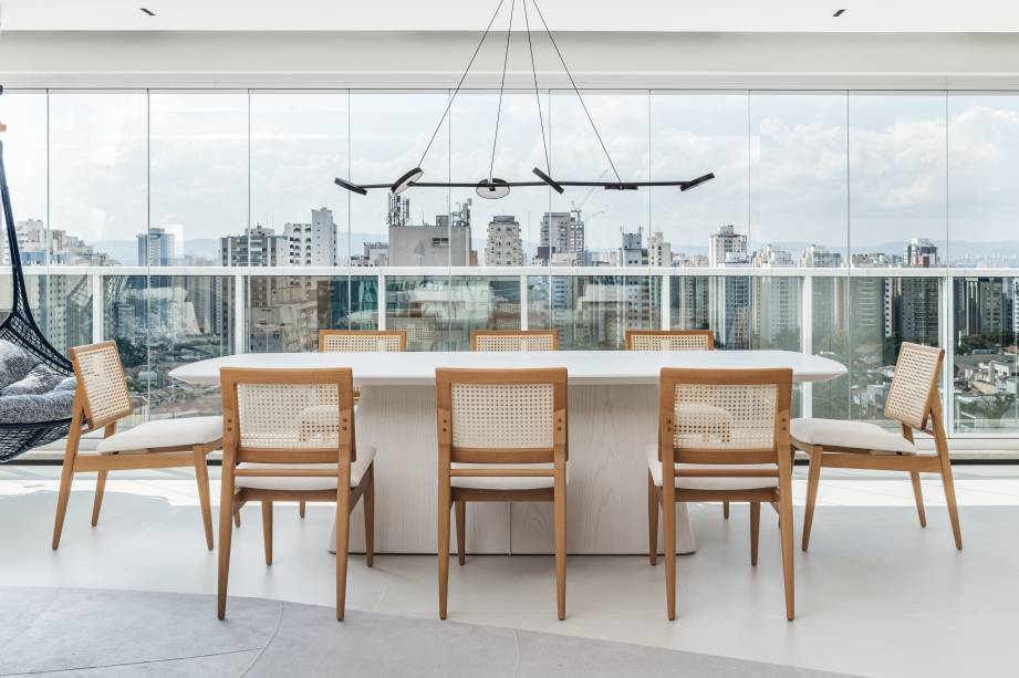 A sala de jantar, com tons predominantemente brancos, passa uma sensação arejada e convidativa. As cadeiras, com detalhes em madeira, complementam a atmosfera de forma harmônica.
