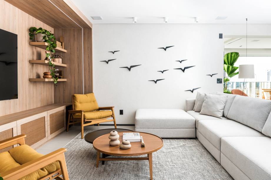 Cada detalhe, desde o sofá de desenho orgânico na sala, até as obras de arte, como os passarinhos do artista Rapha Preto e os quadros pintados pela mãe da cliente, foram cuidadosamente selecionados para complementar e personalizar o espaço.