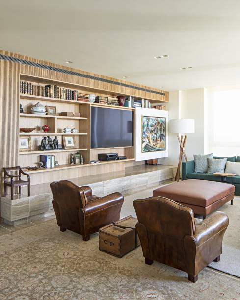 Um painel em carvalho reveste as salas de ponta a ponta onde foi agregado um aparador na sala de jantar e uma estante no estar. Ali, fica um truque: o grande quadro esconde a televisão e desliza num trilho quando precisa ser usada.