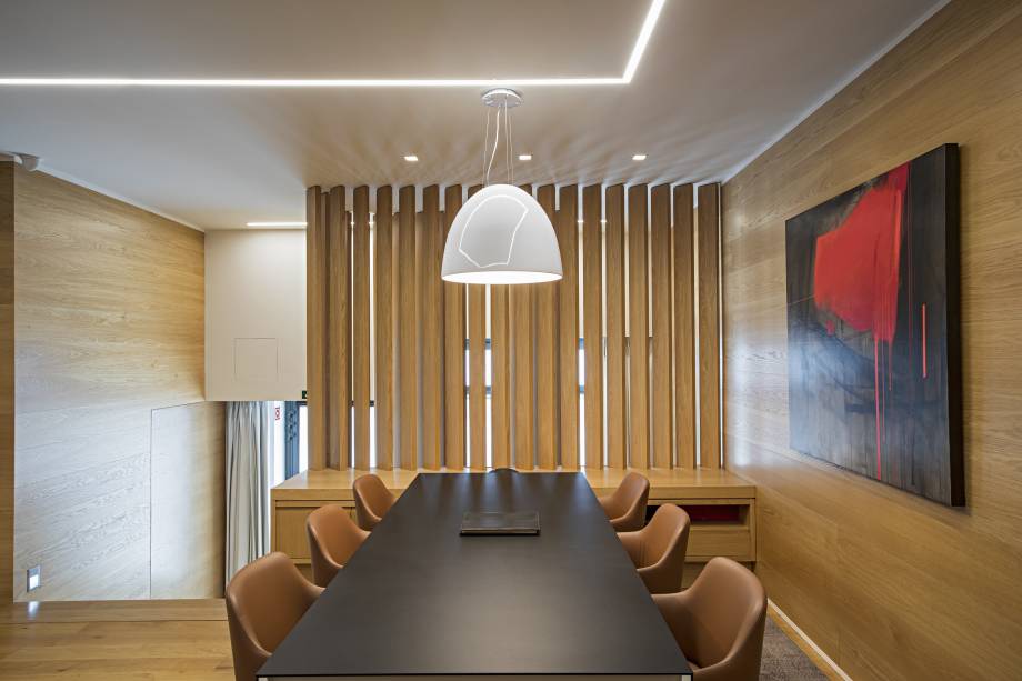 “É um dúplex que fica no nível da rua mas não fica exposto, tem bastante privacidade pois para tornar o local de trabalho ainda menos invasivo, instalamos brises, a solução perfeita para que não seja visível para quem passa. A mesa de reuniões fica no nível mais alto e a sala da secretária no nível de baixo”, explica Maurício.