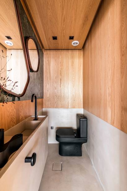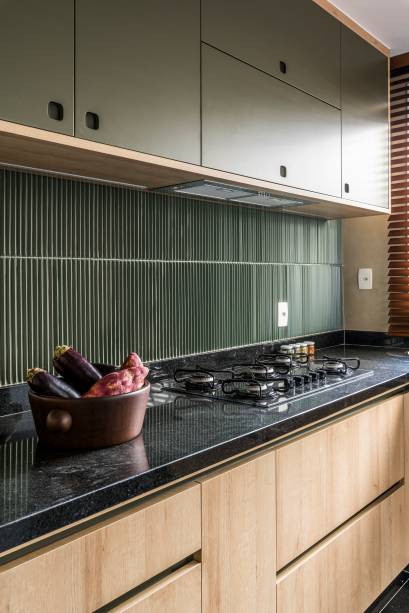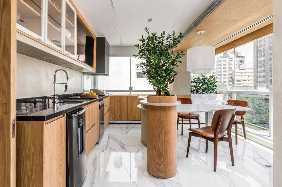 Com função também escultórica, a porta de correr em muxarabi separa a varanda gourmet da sala e foi projetada para refeições rápidas, fazer churrascos e assistir a jogos de futebol em família. A ilha, de onde também sai a mesa com formato orgânico, é o destaque do ambiente.