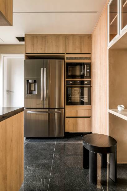 Já a área de hóspedes passou a dispor de uma suíte com cama queen, um quarto com duas camas de solteiro para os netos e um quarto híbrido com escritório, visto que os proprietários necessitavam de um pequeno espaço de trabalho em seus dias na cidade. Em todos os dormitórios, os armários foram desenhados pelos arquitetos com espaços definidos para que a bagagem não atrapalhasse a circulação. “Tudo pensado para receber bem”, conclui a dupla.