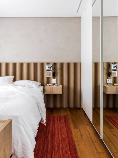 Na área íntima foi adotado o assoalho de cumaru, trazendo mais aconchego para os quartos. Na suíte master, a ideia foi dispor de um espaço confortável e preparado para a permanência do casal na capital paulista, com um grande closet, banheiros separados e uma penteadeira para a cliente.