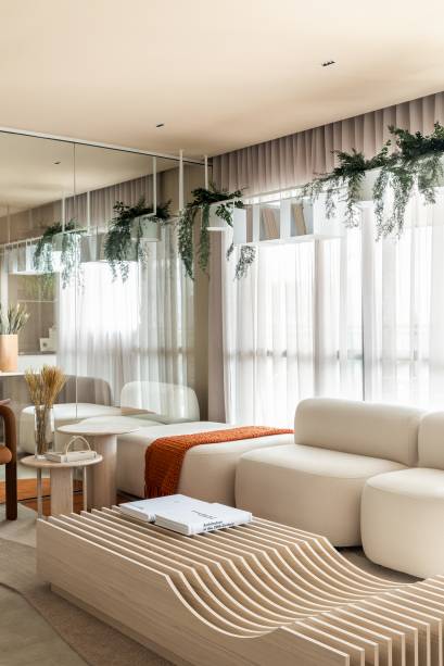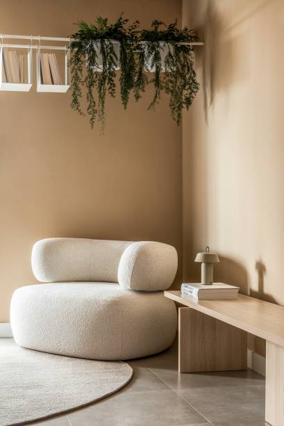 Plantas posicionadas de maneira suspensa complementam o design de interiores, trazendo frescor e leveza. As espécies foram distribuídas estrategicamente para equilibrar os tons terrosos e quebrar a seriedade dos elementos arquitetônicos, sem sobrecarregar a composição.