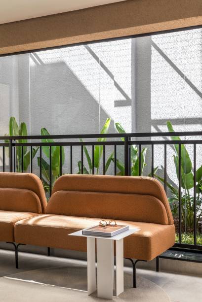 Mobiliários de linhas curvas, como as poltronas e o sofá, suavizam a rigidez dos acabamentos e reforçam a sensação de conforto. A iluminação natural, amplificada por grandes janelas, é complementada por luminárias contemporâneas que acrescentam um toque artístico e funcional ao projeto.