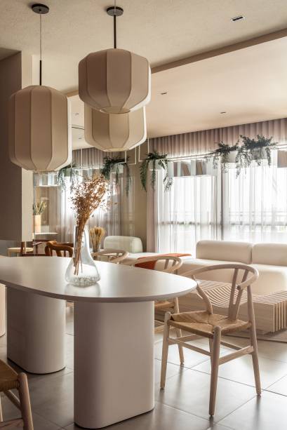 A mesa de jantar redonda em madeira clara reforça a estética orgânica do espaço. Já as cadeiras com encosto curvo e assento em palha remetem ao design escandinavo, enquanto a mesa de centro com ripas de madeira reforça o clima contemporâneo e artístico da decoração.