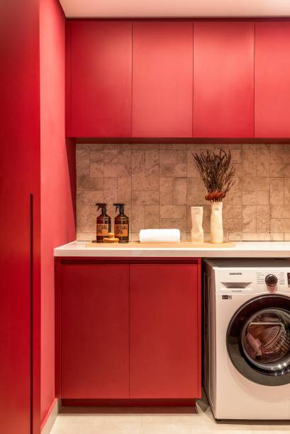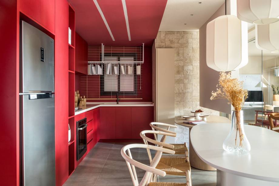 O projeto de Bohrer Arquitetos combina paleta neutra com toques marcantes de vermelho na cozinha e no lavabo.