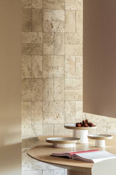 A integração entre living e cozinha favorece a fluidez visual e a funcionalidade, aproximando os espaços de convivência e de preparo das refeições. Uma parede com acabamento texturizado em pedra natural, somada a superfícies suaves e tons terrosos, compõe um jogo de materiais que adiciona profundidade e acolhimento ao ambiente.