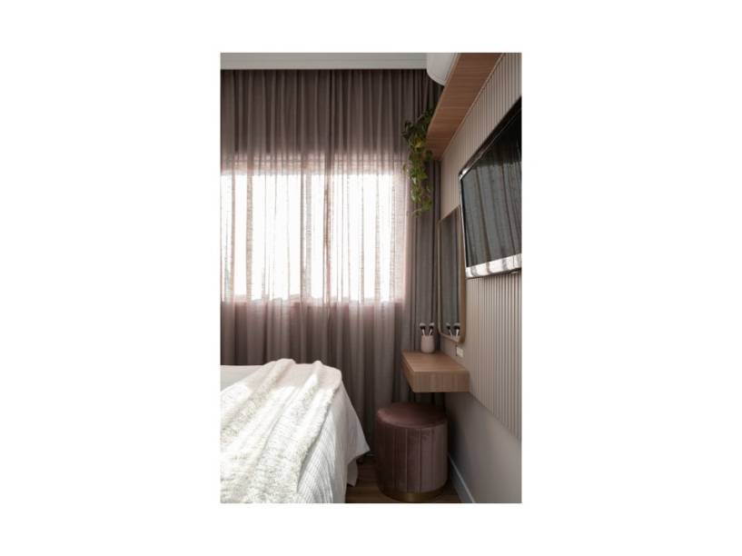 Na suíte do casal, o conforto do quarto se uniu com o home office e a charmosa penteadeira.