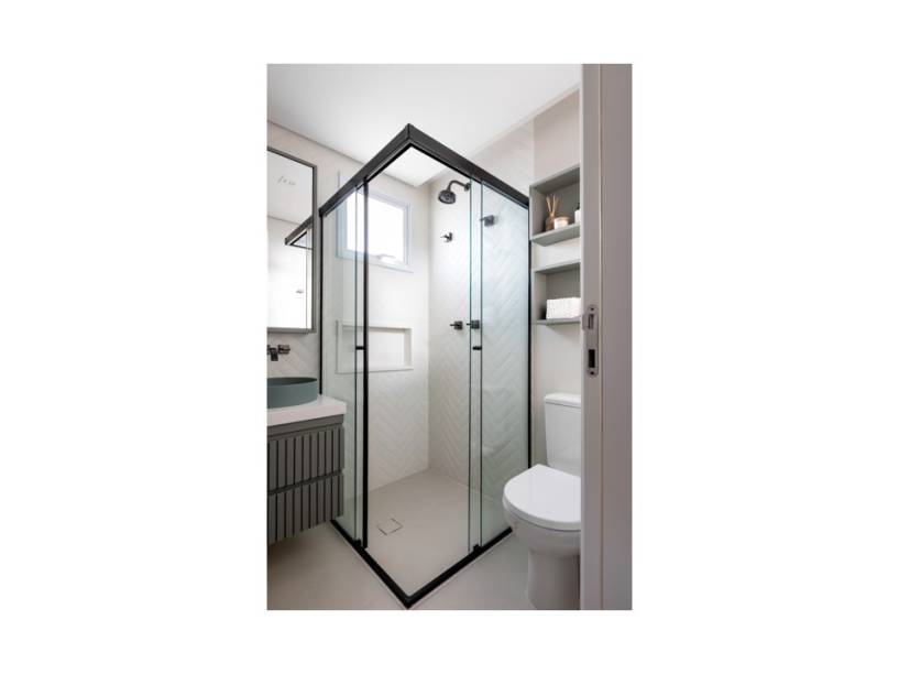 “Com uma das camas suspensa, aumentamos a área de brincadeiras, criando uma cabana com brinquedos e livros. As peças coloridas marcam os locais de armazenagem e compõem o ambiente de forma lúdica. As peças de Lego também estão presentes no banheiro da suíte, transformando o banho em um momento divertido”, finalizam.