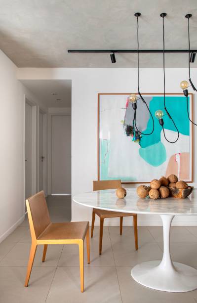 O projeto de decoração foi norteado por algumas peças de design assinado que as clientes já tinham e foram aproveitados no novo endereço, especialmente a mesa de centro Teca, as cadeiras de jantar Milla e as luminárias pendentes Dinn, todas criações do designer Jader Almeida, fornecidas pelo Arquivo Contemporâneo. De resto, é tudo novo, adquirido de acordo com as especificações do projeto.