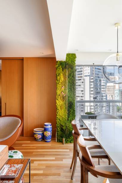 Um dos grandes destaques é a luminária com design de Ingo Maurer no home office. Na sala de jantar, o escritório optou por pendentes que destacam a vista privilegiada do apartamento.