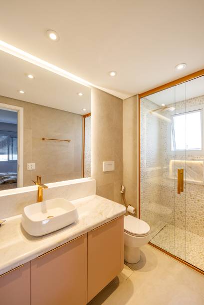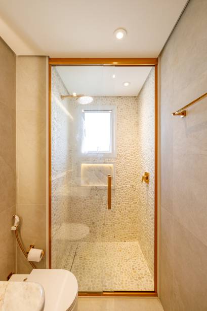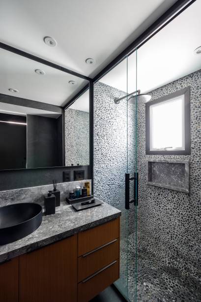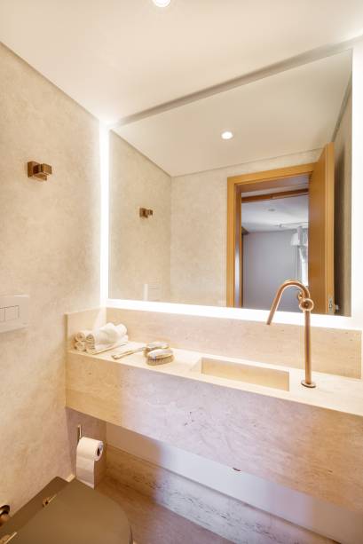 A ideia inicial foi criar cenários confortáveis e aconchegantes para que pudesse receber amigos e a família aos finais de semana. Pensando em cada detalhe, o escritório utilizou diferentes materiais, como madeira natural e mármore travertino romano, além de uma marcenaria personalizada e móveis e luminárias de design assinado.