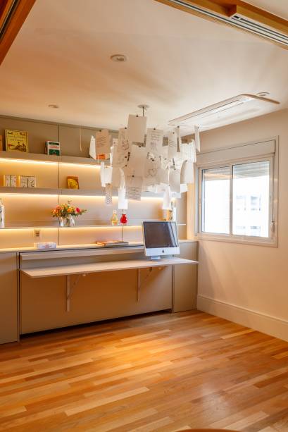 O principal desejo da cliente era ter uma sala ampla para recepcionar e, ao mesmo tempo, um escritório e quarto extra para poder receber os netos. Pensando nisso, foi criado um espaço home office integrado com a sala, que conta com uma escrivaninha e uma cama de solteiro embutida na marcenaria.