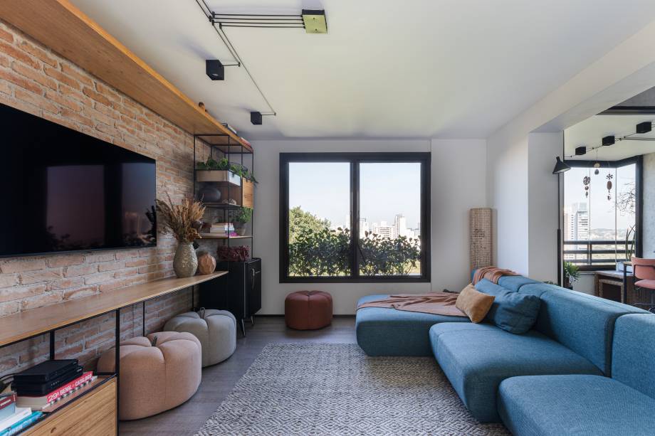 O sofá ilha foi fundamental para a harmonia entre sala de jantar/estar e sala de TV. A cor azul foi o ponto de cor em maior destaque no projeto. “Decidimos descascar os pilares e vigas da área social, deixando o concreto aparente – o que trouxe um ar mais modernista ao apartamento”, explica a profissional.