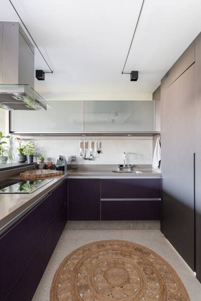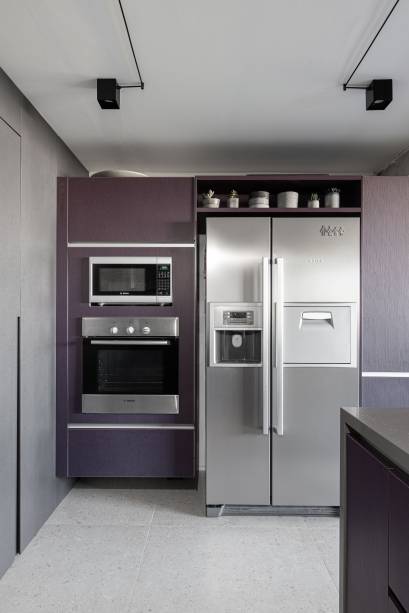Um dos pedidos dos clientes, foi manter os armários planejados da cozinha integrada. Como os armários eram na cor berinjela, o escritório adaptou paleta de cores para que tudo ficasse harmônico.