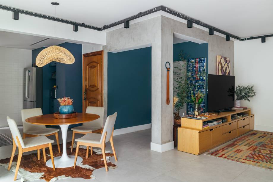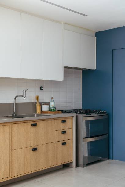 A cozinha ficou totalmente aberta para sala de estar e emendou também na de jantar. O azul, cor favorita de todos, foi o fio condutor do projeto, que também inclui móveis e objetos da família.
