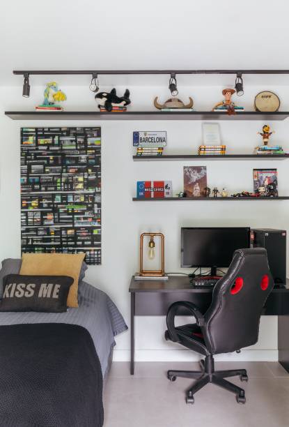 Ao projetar os quartos dos filhos, a mãe-arquiteta teve o cuidado de refletir a personalidade de cada um. Com uma pegada bem moderna, o quarto do filho mais velho, de 15 anos, ganhou parede de cimento queimado, mesa de estudo, prateleiras, baú e trilhos de iluminação pretos. Além de uma mesa de estudo e elementos decorativos, como skate e placas de metal de diferentes países e toy art, complementam o décor.