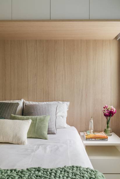 O quarto do casal tem apenas 14 m² e era comprido. Então, a cama ganhou destaque com um requadro da marcenaria e o espaço, apesar do aconchego da madeira, passou a ser amplo. A cama baú e a sapateira ripada também foram planejadas para otimizar os espaços.