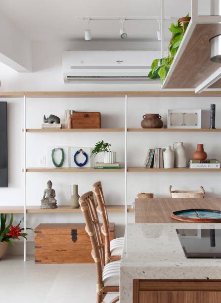 Os novos proprietários encomendaram aos arquitetos Ricardo Melo e Rodrigo Passos um projeto de reforma completa do imóvel, com decoração integralmente nova em todos os cômodos. “Eles pediram para integrar a sala e a cozinha e criar uma suíte de casal com o banheiro integrado ao dormitório”, conta Ricardo.