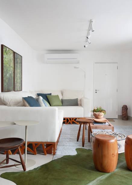 Na sala de tv, Ricardo destaca a estante clara, com design super leve, que ajudou a alongar o espaço e, no estar, o tapete de pele de vaca tingido de verde oliva, sobreposto ao tapete de fibra de garrafa pet reciclada (também da Galeria Hathi).