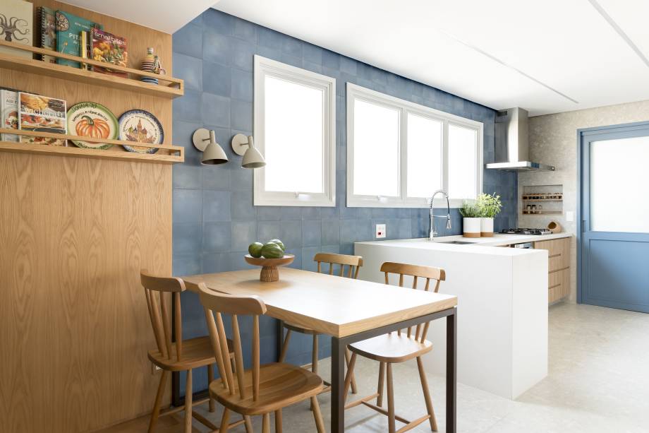 Já cozinha integrada à sala, a cliente queria tons de azul. Para fugir do óbvio, as arquitetas usaram diferentes revestimentos nas paredes, variando não só o tamanho das peças como também as cores, entre tons de azul, cinza e terracota.