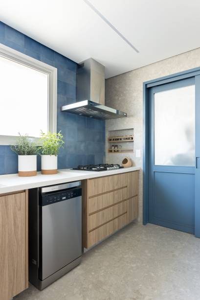 Apê de 180 m² ganha azul na marcenaria e nos revestimentos da cozinha
