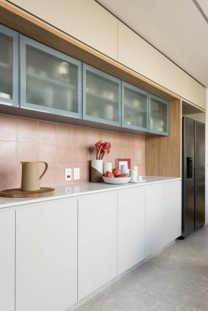 Os armários superiores foram projetados com portas de correr em vidro canelado para deixar o ambiente visualmente mais leve.