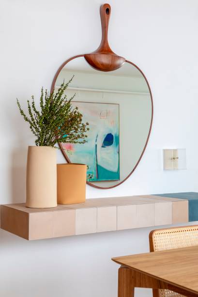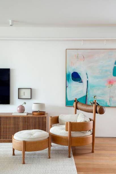 Na decoração, todo o mobiliário e a maioria dos adornos são novos. Entre as peças do apartamento antigo que foram aproveitadas, a arquiteta destaca o quadro colorido ao lado do rack da sala, da artista Manoela Monteiro. “Na sala, mesclamos a icônica poltrona Vivi, do Sergio Rodrigues, que representa o período moderno brasileiro, com criações de designers contemporâneos, como Jader Almeida e Lucas Recchia”, ressalta.
