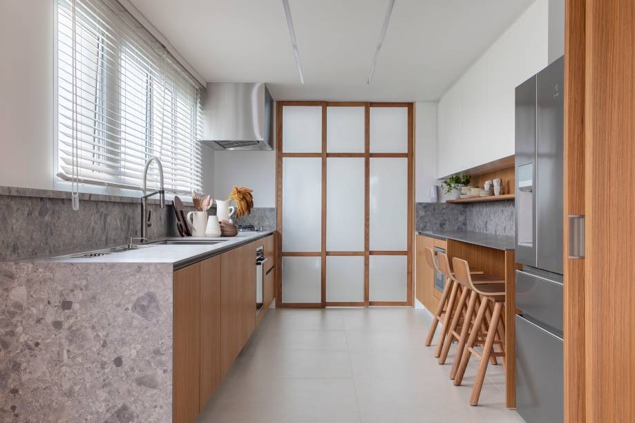 Entre as principais modificações na planta do imóvel, a arquiteta conta que a cozinha foi ampliada e conectada à sala através de uma marcenaria com portas de correr. Além disso, o acesso à antiga circulação íntima (que era próximo à sala de estar e o hall de entrada) foi fechado para criar um bar ao lado do lavabo e os quartos passaram a ser acessados por outro local.