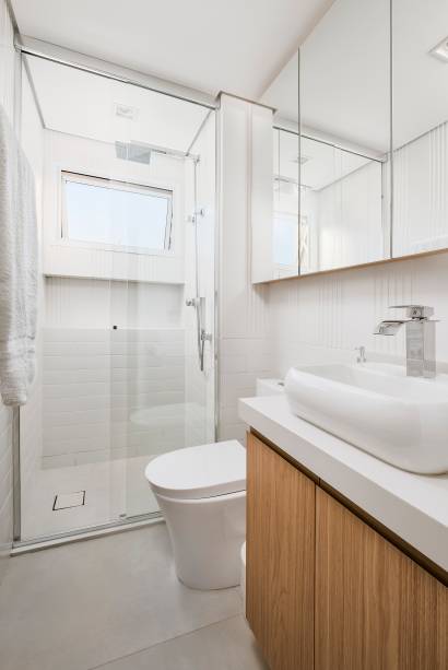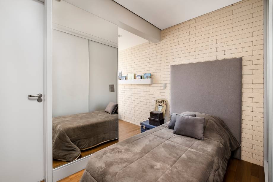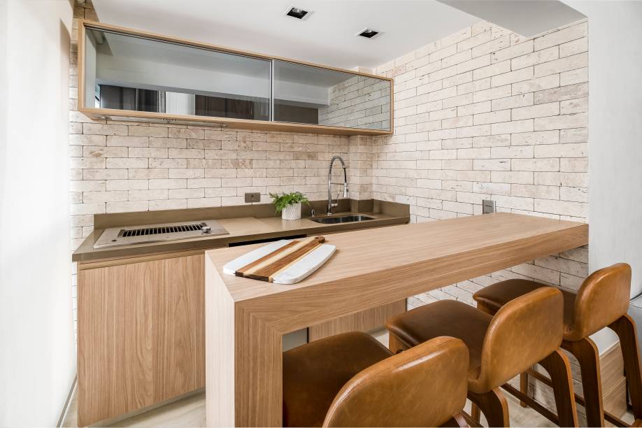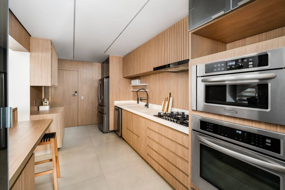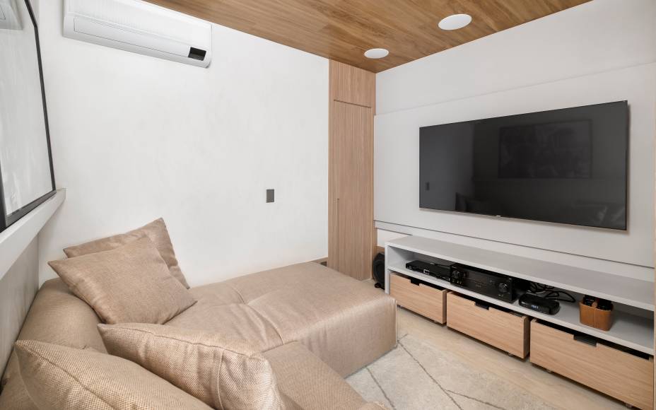 “Priorizamos o convívio social com espaços integrados e destacamos os espaços gourmets na varanda e cozinha. Lá, temos uma decoração muito semelhante à sala para prover a sensação de continuidade. No living, destacamos a altura do pé-direito duplo com o uso de madeira no teto. Enquanto isso, o quarto de hóspedes funciona como sala de TV e ajuda a organizar a estrutura dos quartos, que fica totalmente preservada em dias de evento”, explica Daniela.