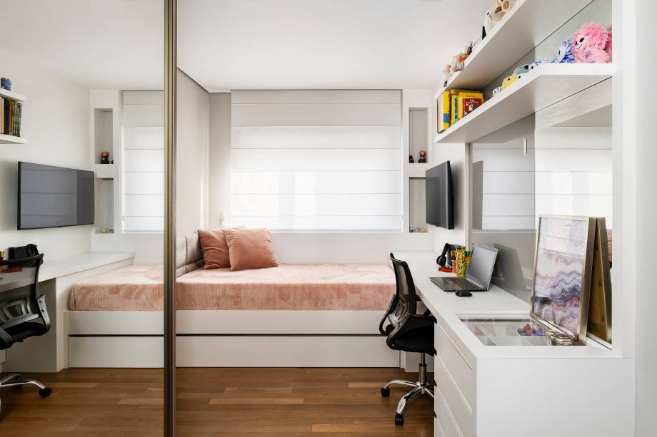 “Alteramos o layout como um todo e ampliamos os dormitórios com a integração de pequenas varandas. Incluímos também um lindo mezanino que tem a função de escritório e abriga um simulador de corrida automobilística“, diz a profissional.