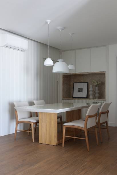 Na sala de estar, prateleiras expõem livros, objetos de decoração e plantas. Já na sala de jantar, além dos armários de apoio, um nicho em mármore travertino nacional conta com iluminação embutida.
