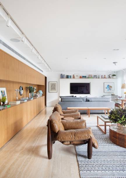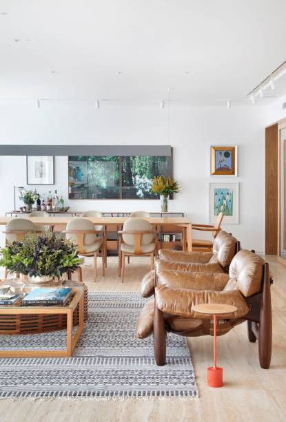 Na decoração, que segue o estilo contemporâneo atemporal, só foram aproveitadas do acervo da família a poltrona Lounge com banqueta de Charles Eames (que hoje está na sala de tv) e a mesa de centro Maria Preciosa, assinada por Etel Carmona. Todos os outros móveis são novos.