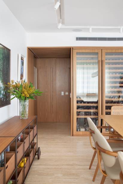 Segundo as arquitetas, o projeto partiu da adega generosa solicitada pelo cliente, que foi integrada a uma grande marcenaria desenhada pelo escritório e instalada na sala, que concentra ainda louceiro, estante e apoio da tv. Além de ter se tornado o coração da casa, esta solução funciona também como elo de ligação entre os ambientes de estar, jantar e tv.