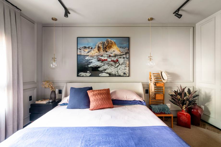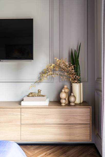 No quarto do casal, um tom de bege bem suave foi aplicado nas paredes, com detalhes em boiserie, madeira clara e piso em tom de mel, criando um ambiente calmo e aconchegante.