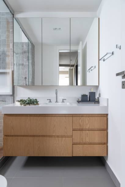 Para o closet, um dos desejos da cliente era ter sua penteadeira, com uma iluminação adequada e espaço para organizar suas maquiagens e joias. Espelhos dão amplitude e a madeira se contrapõe à marcenaria cinza escuro.