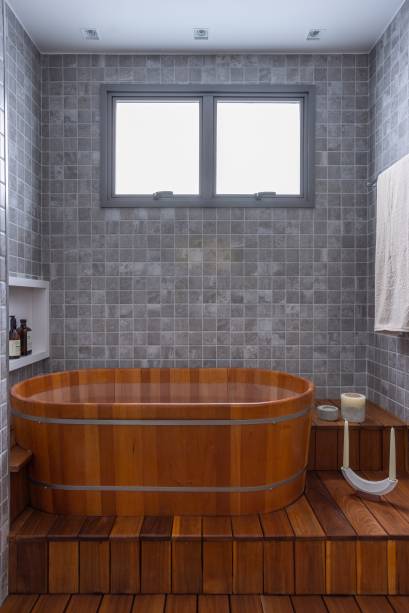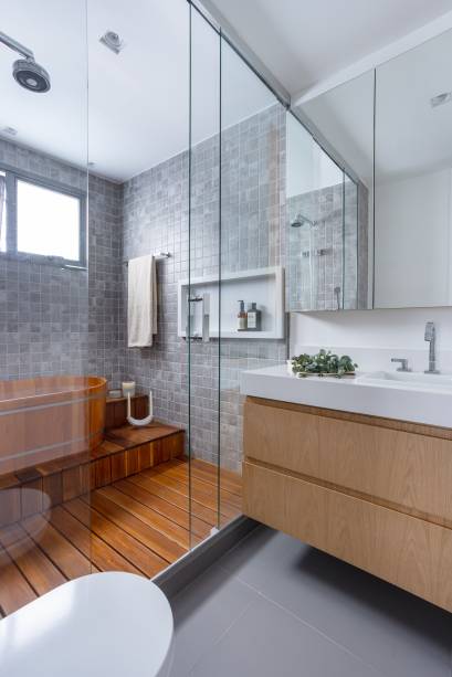 O banheiro ganhou ares de spa com piso de deck na área do box e ofurô, desenhado pelo escritório de Si Saccab.