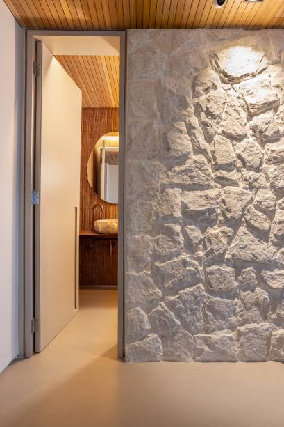 O hall de entrada é integrado ao living e a porta fica em frente à parede de pedra, que continua para o estar. Os brises de tora de madeira dão um ar rústico e escultórico ao espaço e também acompanham a estante embutida de aço corten na outra parede. O forro de madeira aparece em toda a área social.