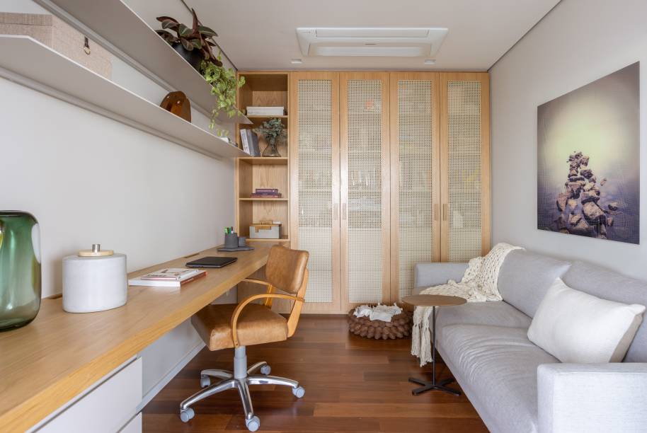 O home office ganhou uma atmosfera leve e aconchegante com piso de madeira, paredes em tons claros, marcenaria feita de carvalho americano com palha indiana e um sofá confortável. Aqui, além de espaço de trabalho e estudo, também foi pensado para ser um canto de descanso e leitura.