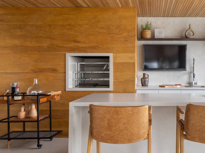 “O cliente optou por manter a esquadria que divide o living do terraço, pois utiliza bastante a área da churrasqueira“, explica a arquiteta. Já na separação da cozinha e da área gourmet, a esquadria foi retirada e foi instalada uma nova porta camarão, que permite a integração dos dois ambientes, se necessário.