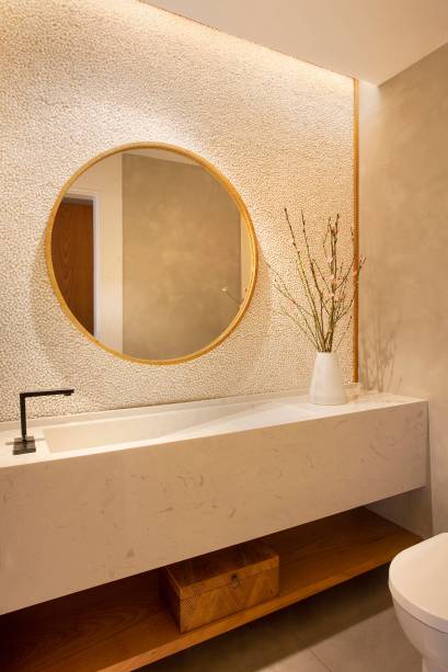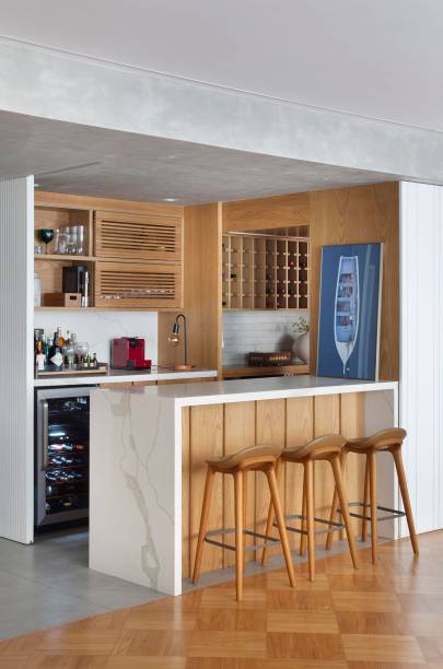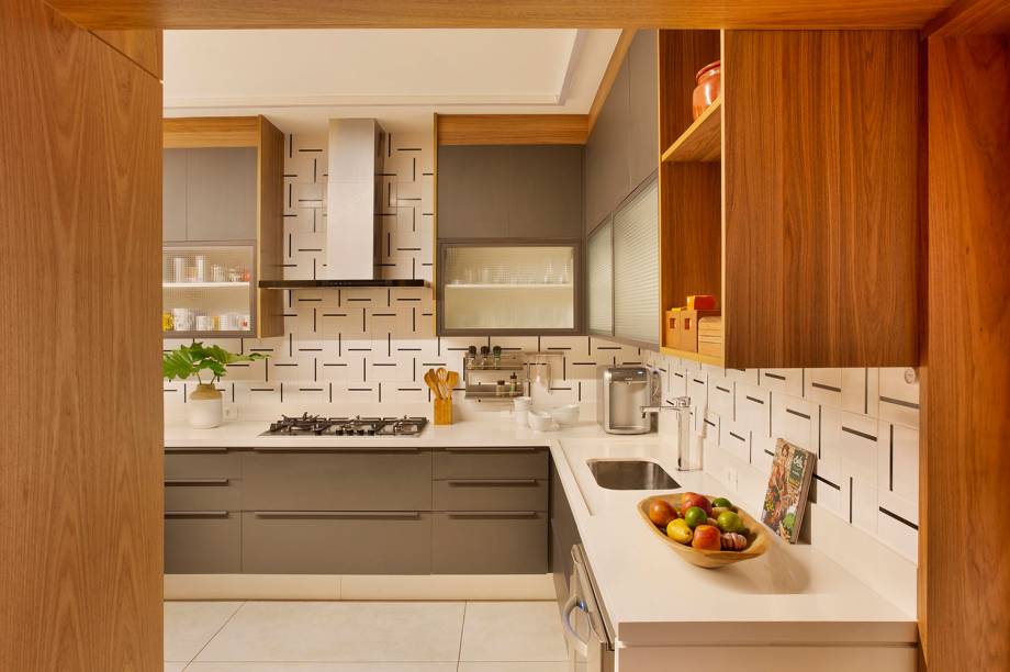 “Propus criar uma entrada lateral para a cozinha e, na passagem, criar um bar com adega em marcenaria, além de uma porta de correr para a sala de jantar”, explica Carmen.