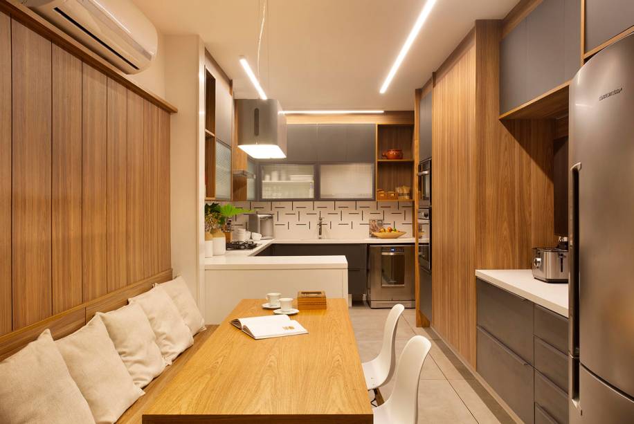 Além disso, um dos pedidos foi integrar a cozinha com a sala através de uma grande porta de correr. Porém, na hora da demolição, descobriu-se que, na parede a ser derrubada, passava a tubulação de gás de todos os apartamentos, além de um enorme pilar em “L”.