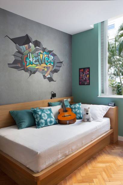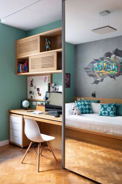 O quarto do menino conta com marcenaria em freijó, laca branca e cinza, com pontos de cor no painel colorido, com o nome dele. O tom verde das paredes se repete na cerâmica do banheiro.