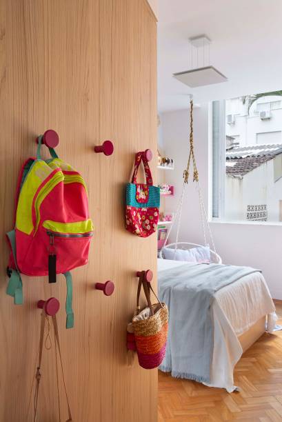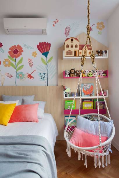 No quarto da menina, a madeira bem clarinha contrasta com cores vibrantes na marcenaria e acessórios.