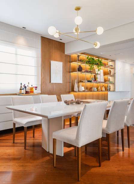 Um dos destaques é grande parede que se estende desde a área de estar até a sala de jantar, planejada de forma contínua e integrada. Elementos como a lareira, estantes sobre uma prancha de mármore, buffet e cristaleira foram cuidadosamente dispostos ao longo dessa parede, conectados pelo painel de madeira e pelo design contínuo dos volumes.
